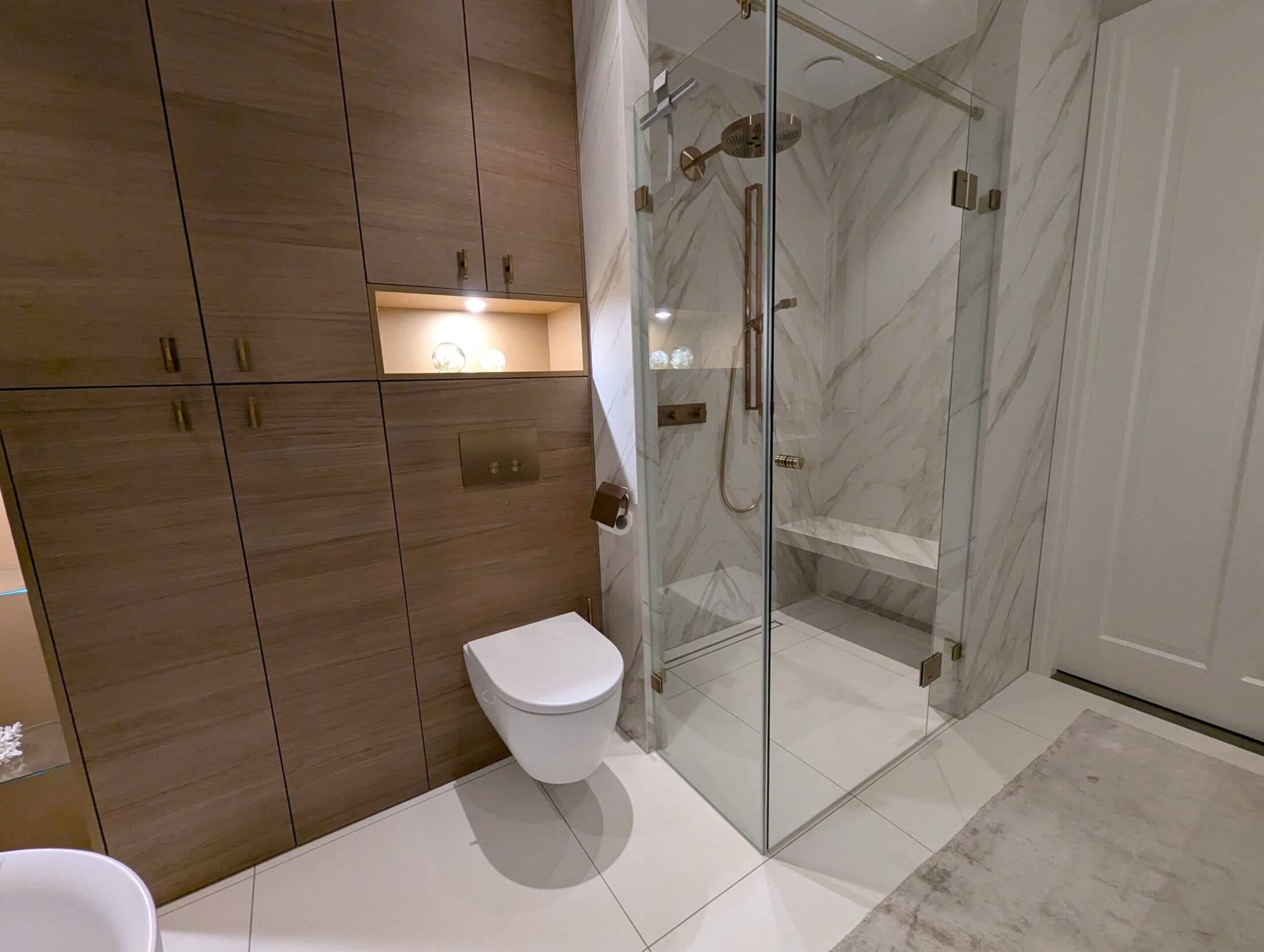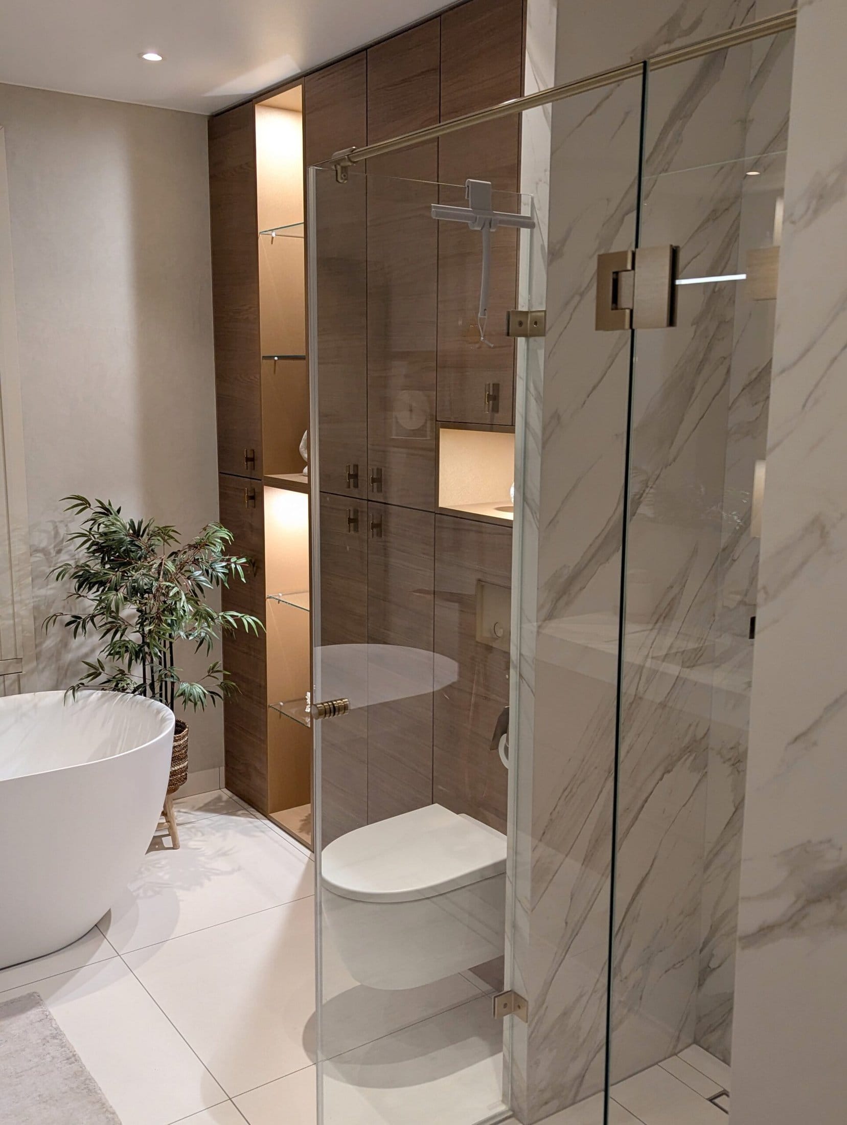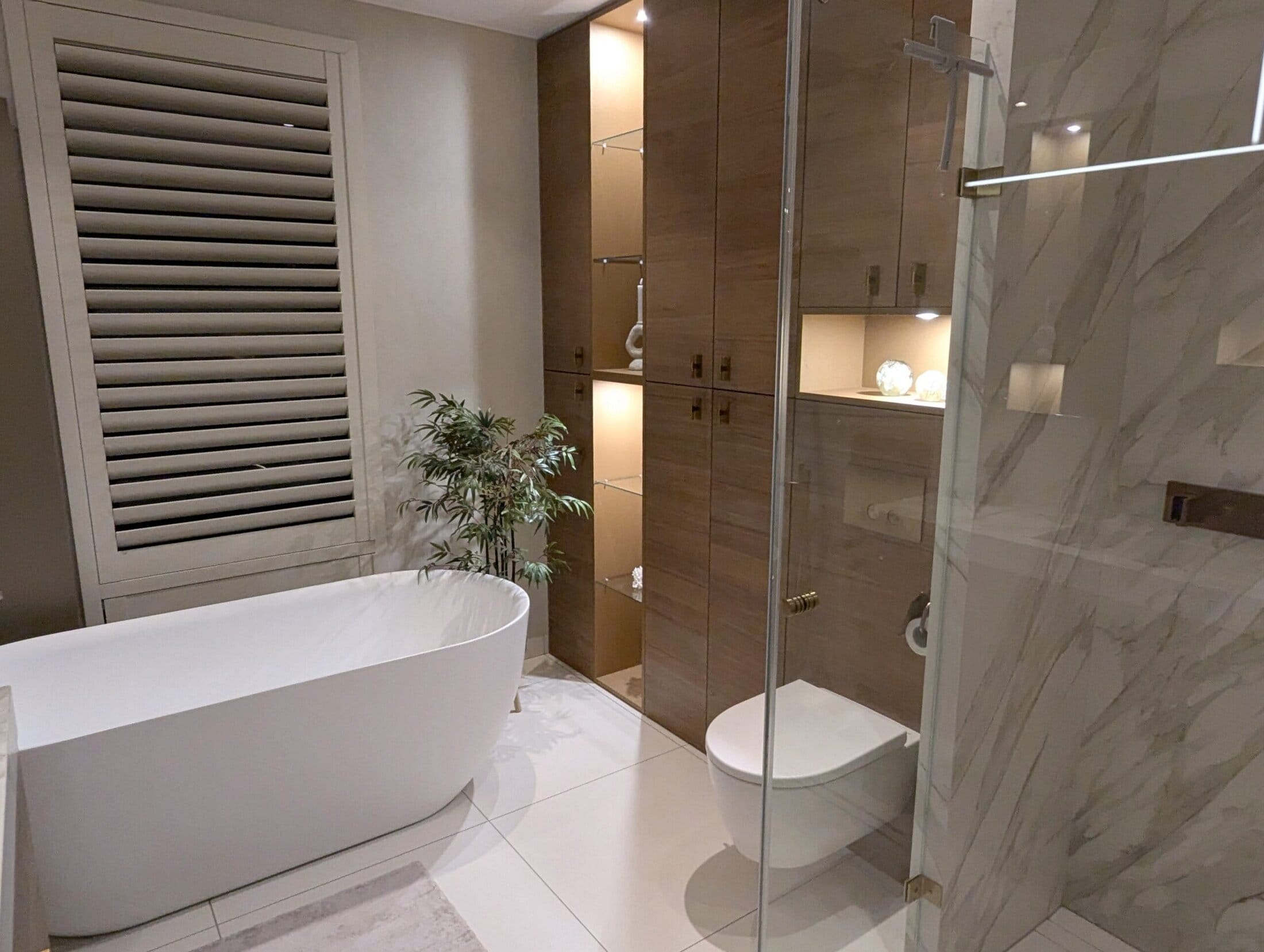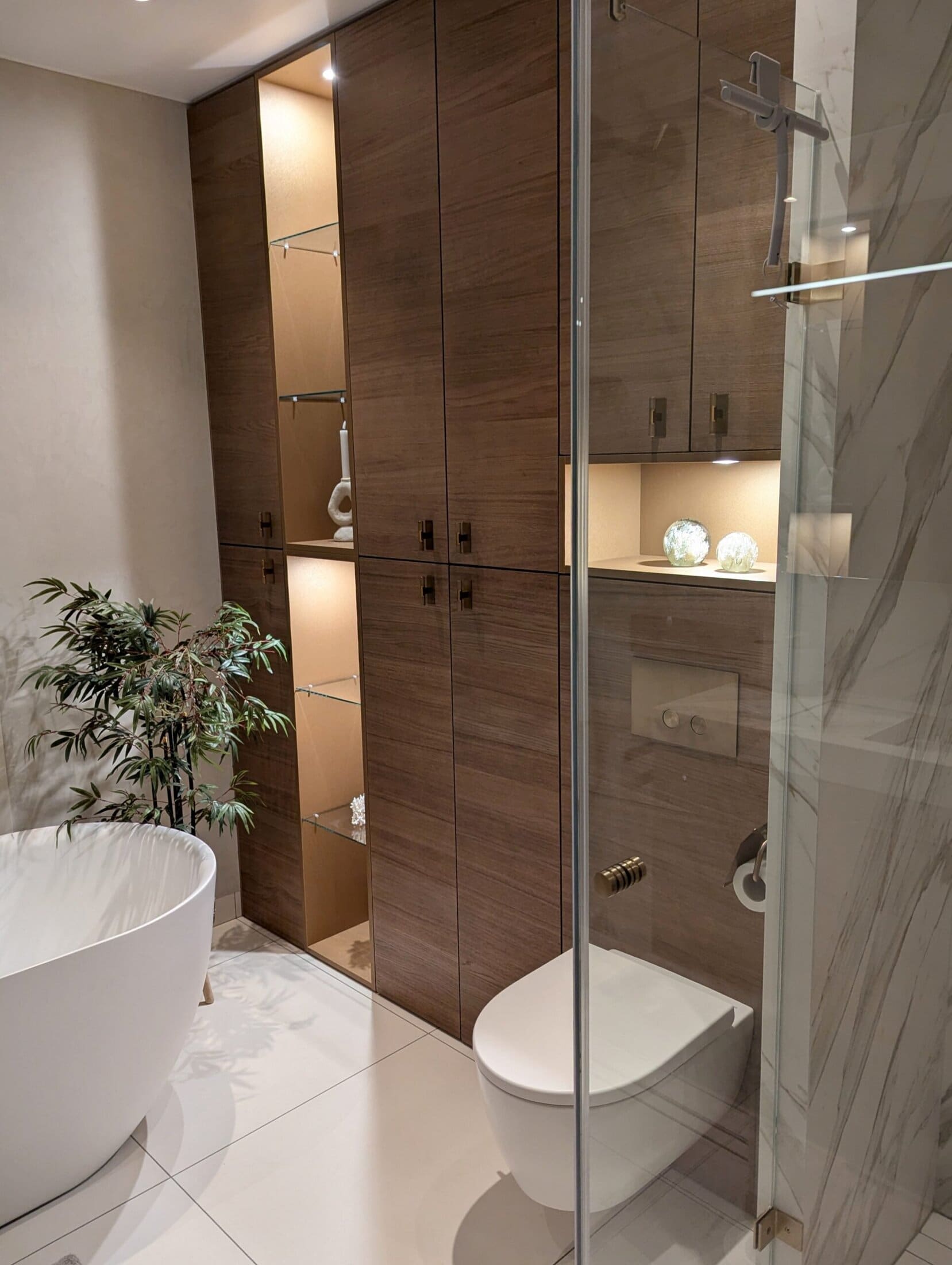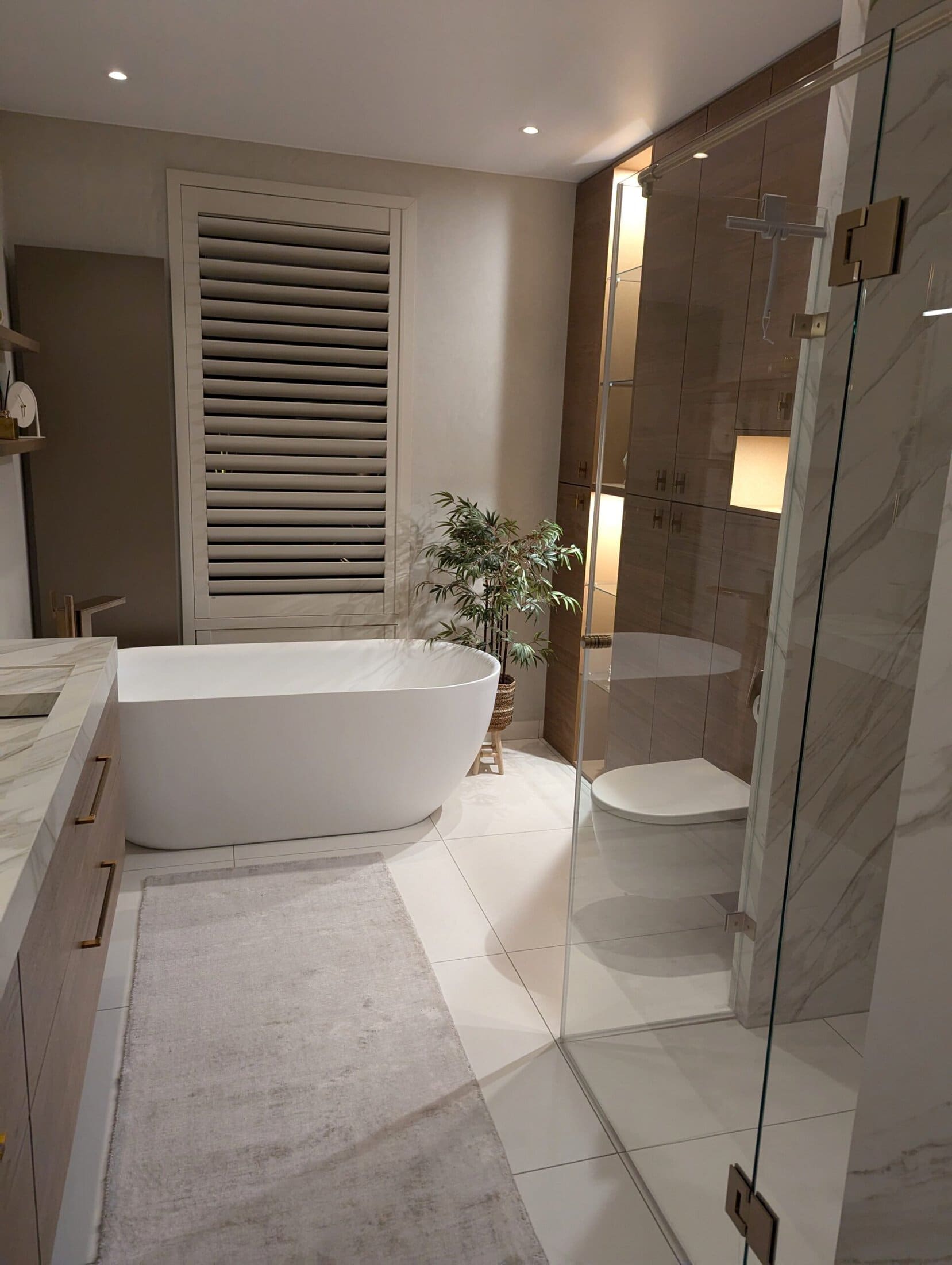 De doordachte indeling – met een kastwand waarin het toilet subtiel is geïntegreerd, naast het matwitte bad. creëert een harmonieuze en elegante balans.