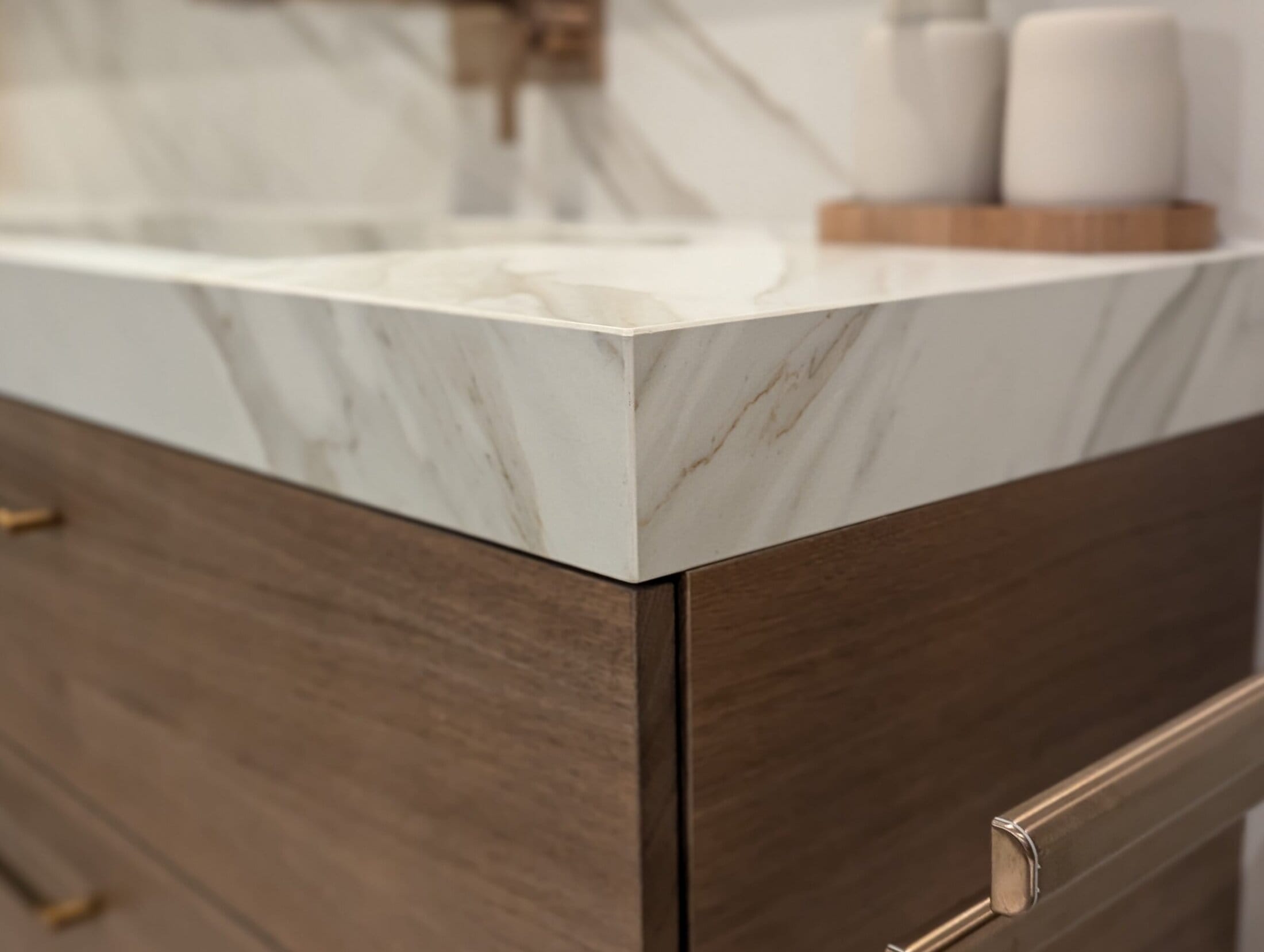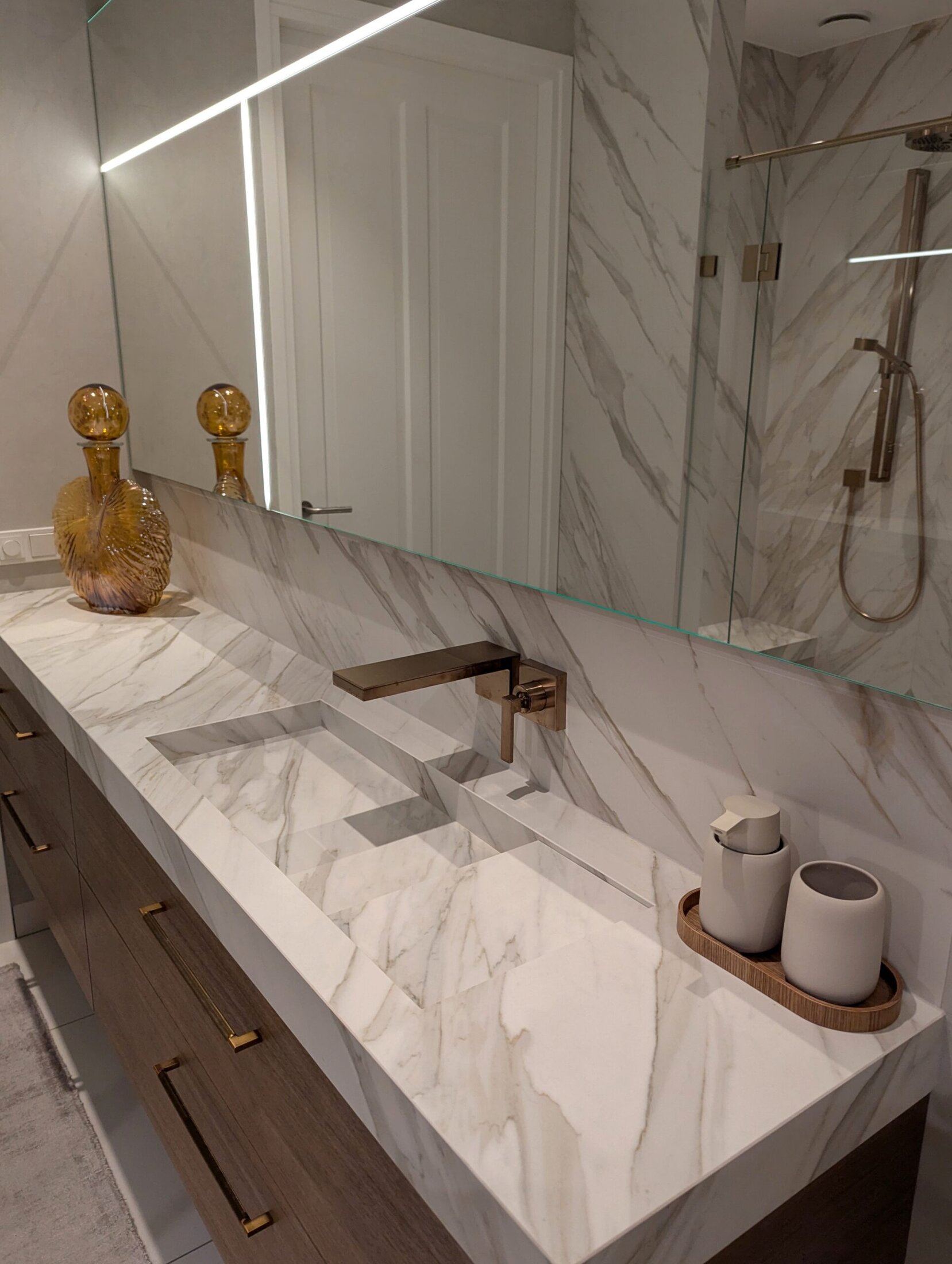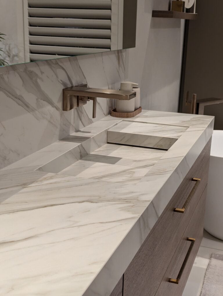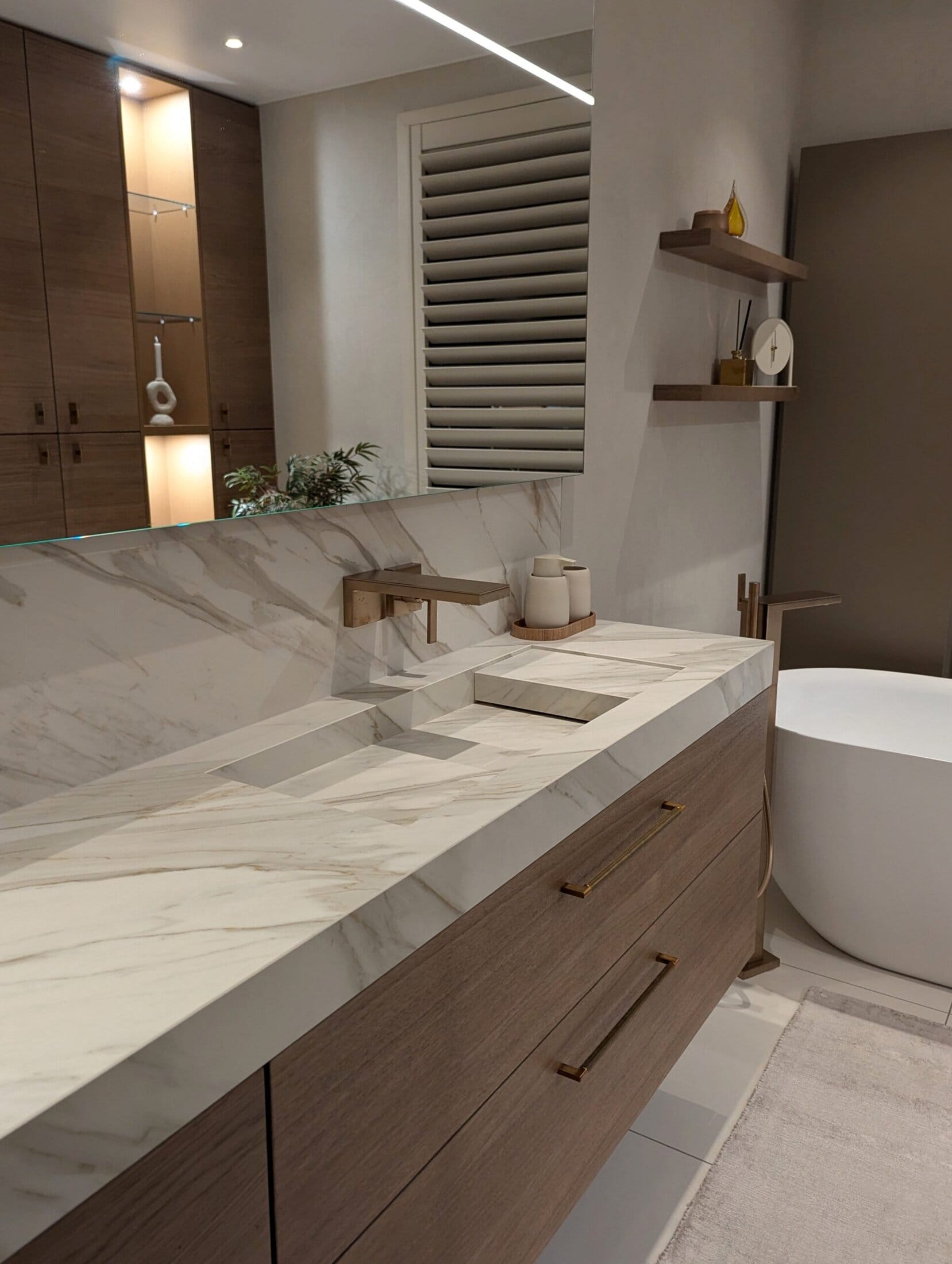 Het matte keramiek Neolith Calacatta Gold vormt een schitterend geheel met de warm gebeitste eiken meubelen, verfijnd afgewerkt met chic bronzen beslag en bijpassende kranen.
