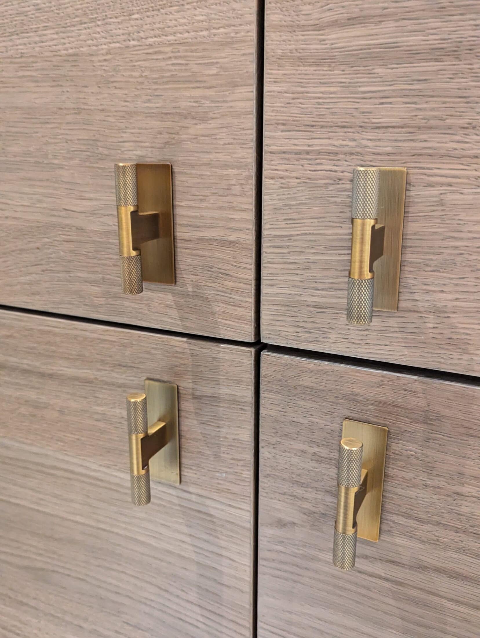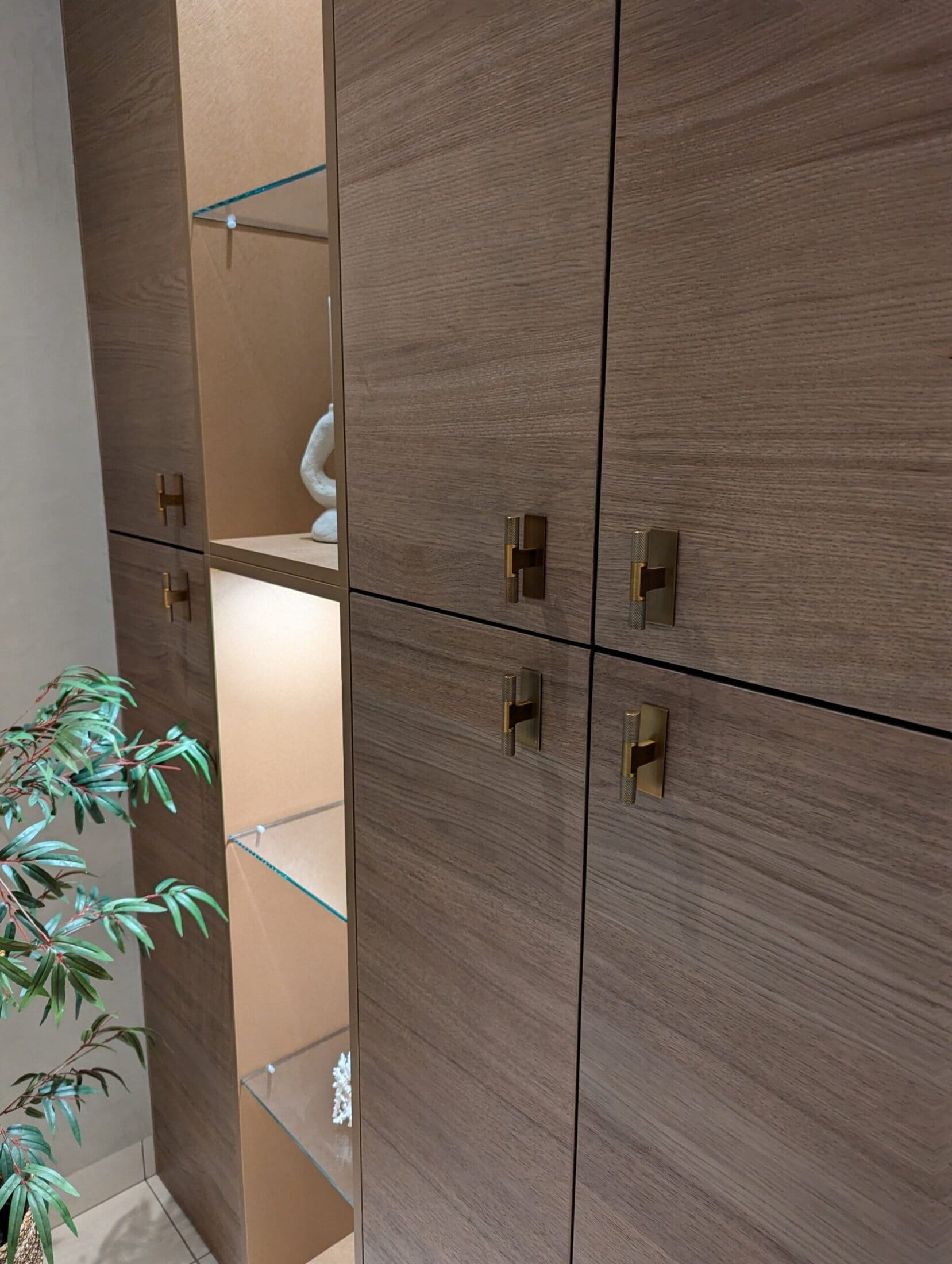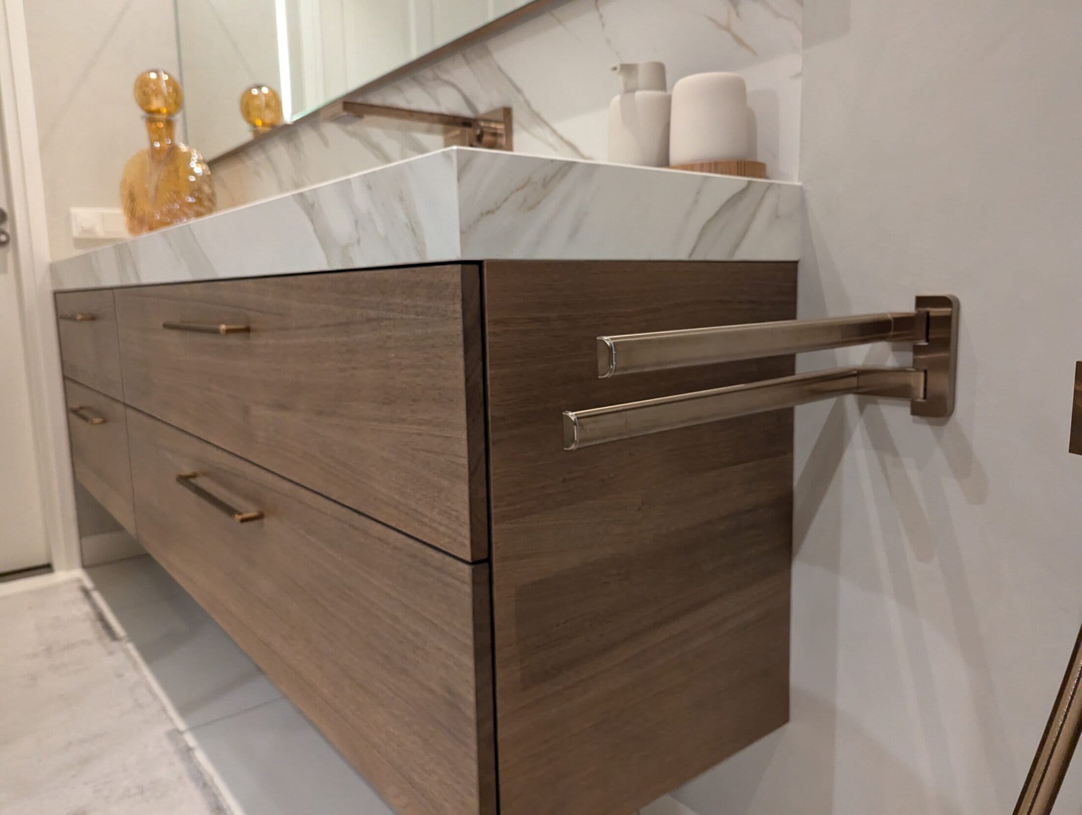 Het matte keramiek Neolith Calacatta Gold vormt een schitterend geheel met de warm gebeitste eiken meubelen, verfijnd afgewerkt met chic bronzen beslag en bijpassende kranen.