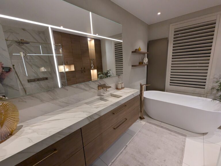 De spiegel met speelse lichtlijnen geeft de ruimte extra diepte en laat haar optisch groter aanvoelen.