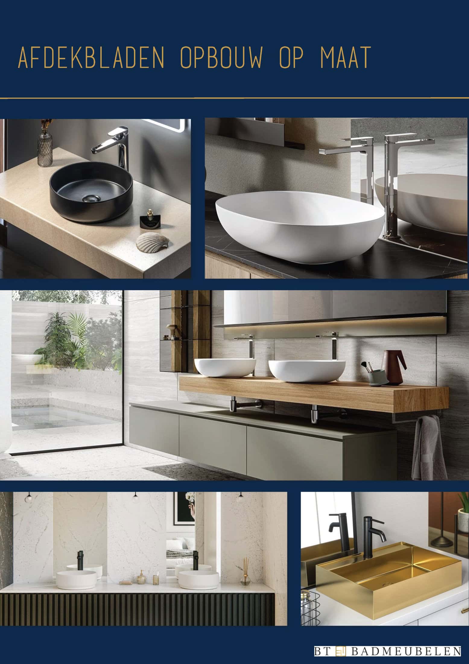 Kies je voor opbouwwaskommen dan ben je nog meer flexibel in positie en maatvoering, daarin bieden we dezelfde materialen als afdekblad aan, waar de waskommen op geplaatst worden