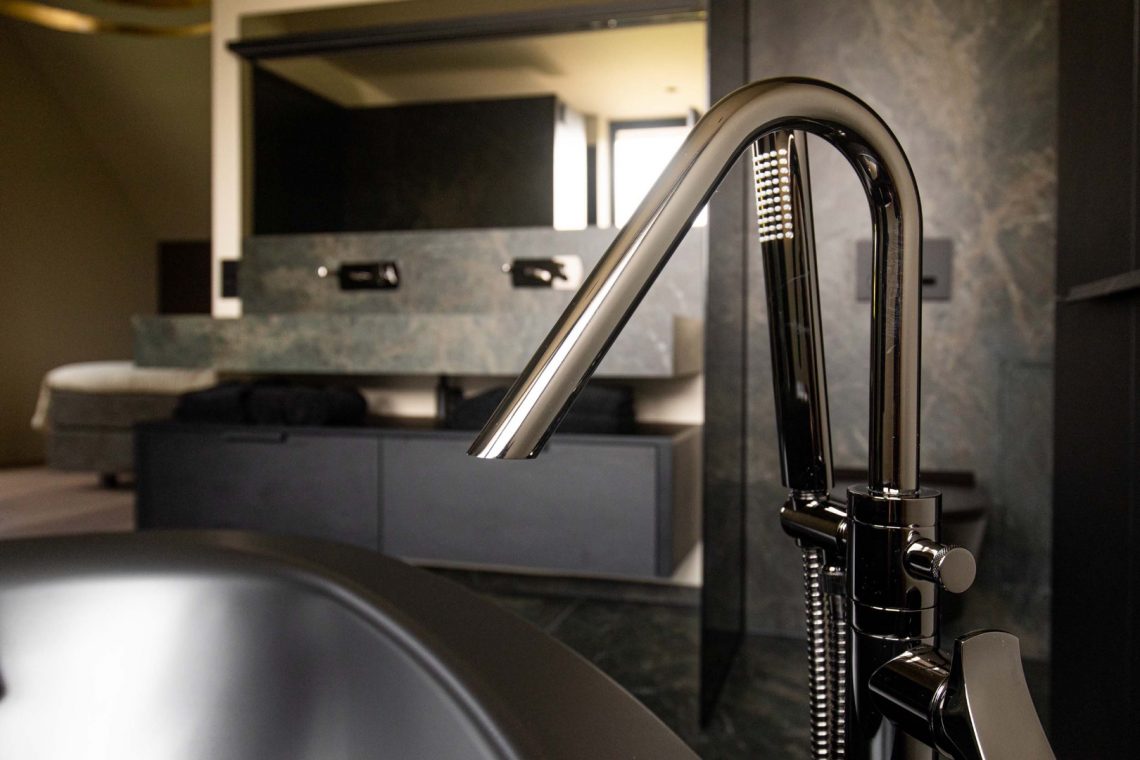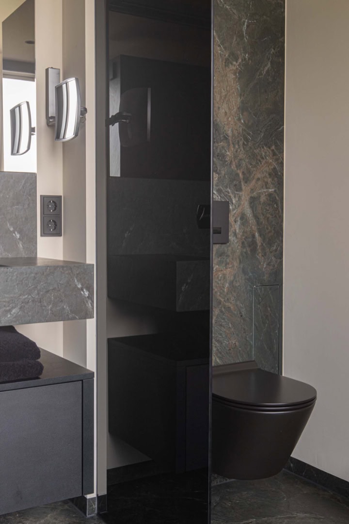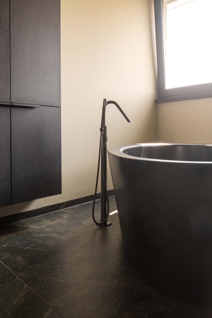 De Frost opleggrepen sluiten naadloos aan bij de gunmetal kranen en zwarte accenten, zoals de kaders van de douchewand, wat zorgt voor een harmonieus en uitgebalanceerd geheel.
