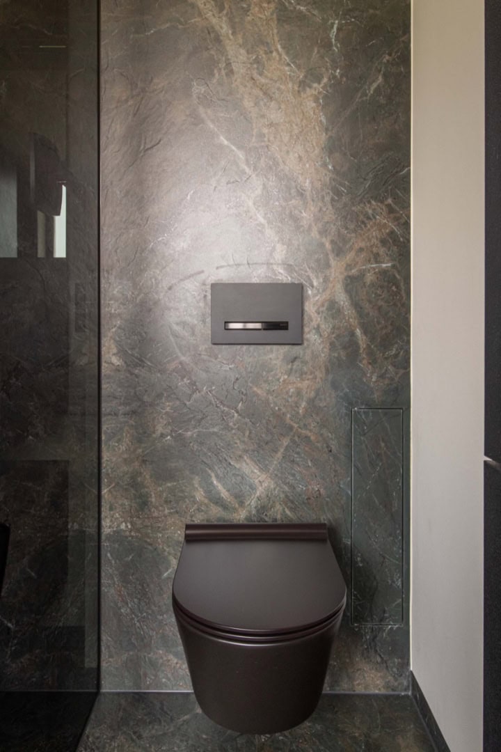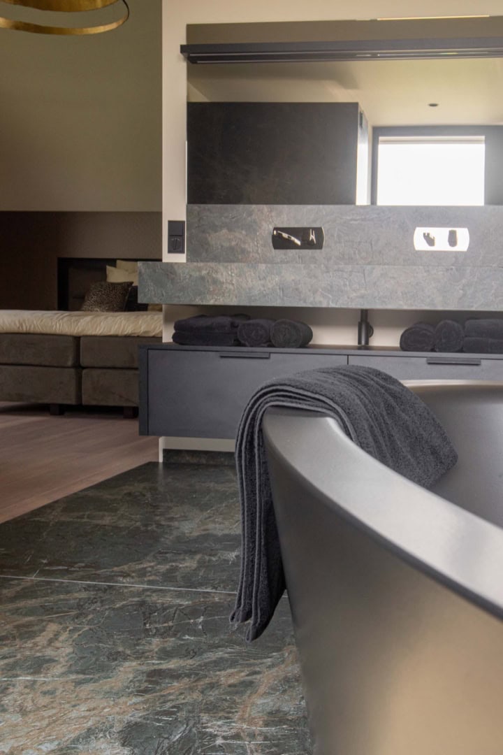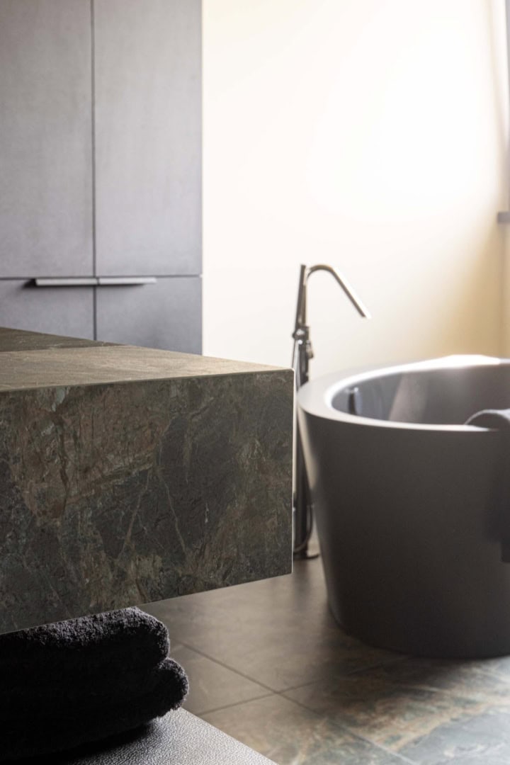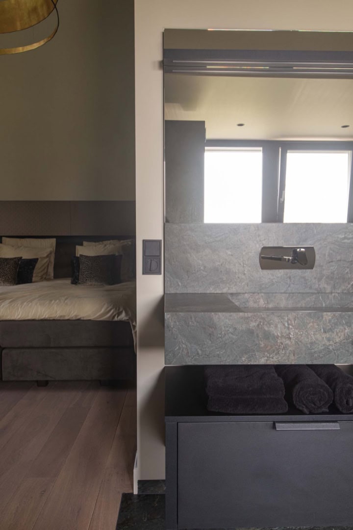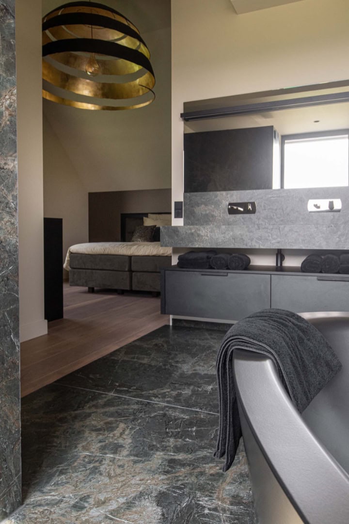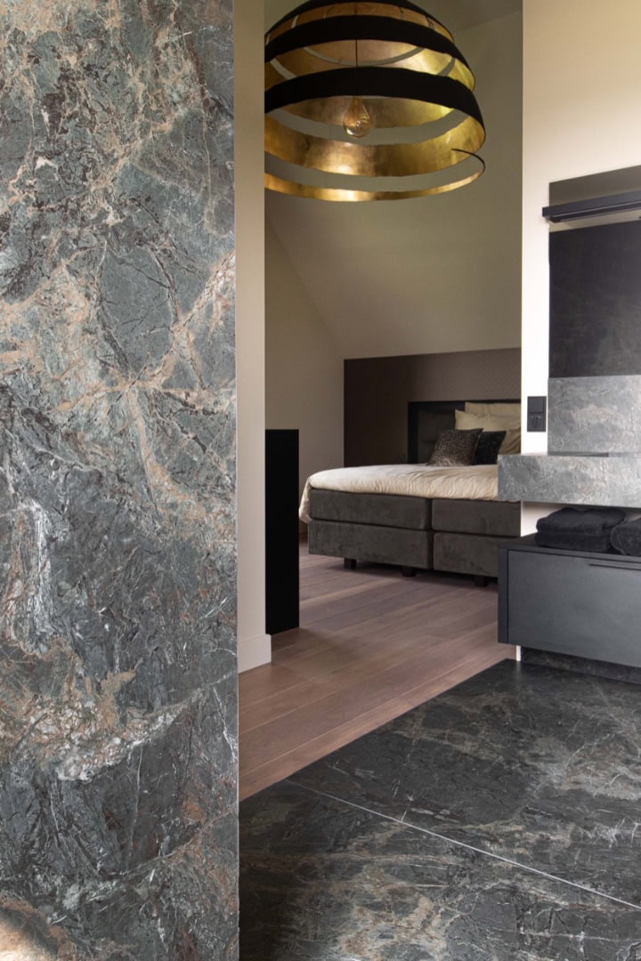De rijke texturen en subtiele kleurschakeringen versterken elkaar en creëren een serene, luxueuze sfeer.