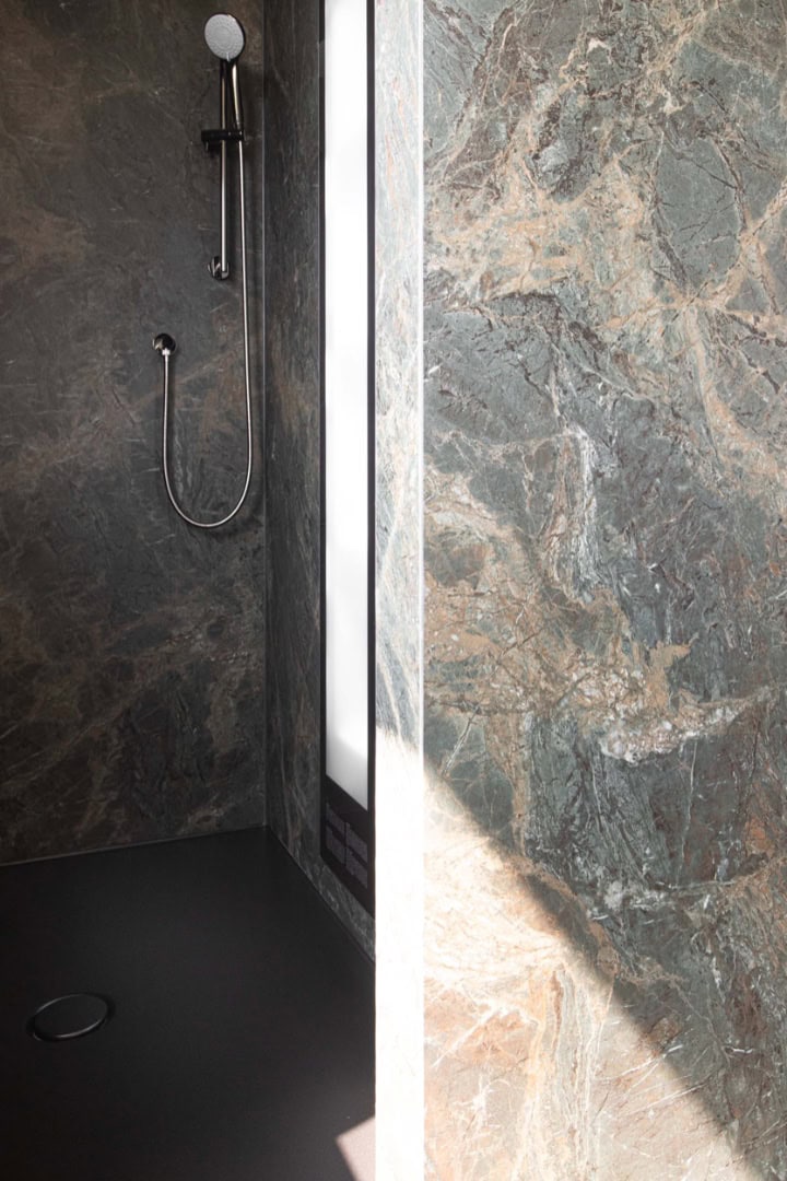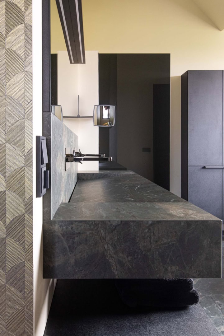 In zowel de ensuite badkamer als de gastenbadkamer komt verfijnd maatwerk tot uiting in wastafels uitgevoerd in Neolith Amazonico, gecombineerd met onze meubelen in DecoLegno plaatmateriaal U129 Primofiore.