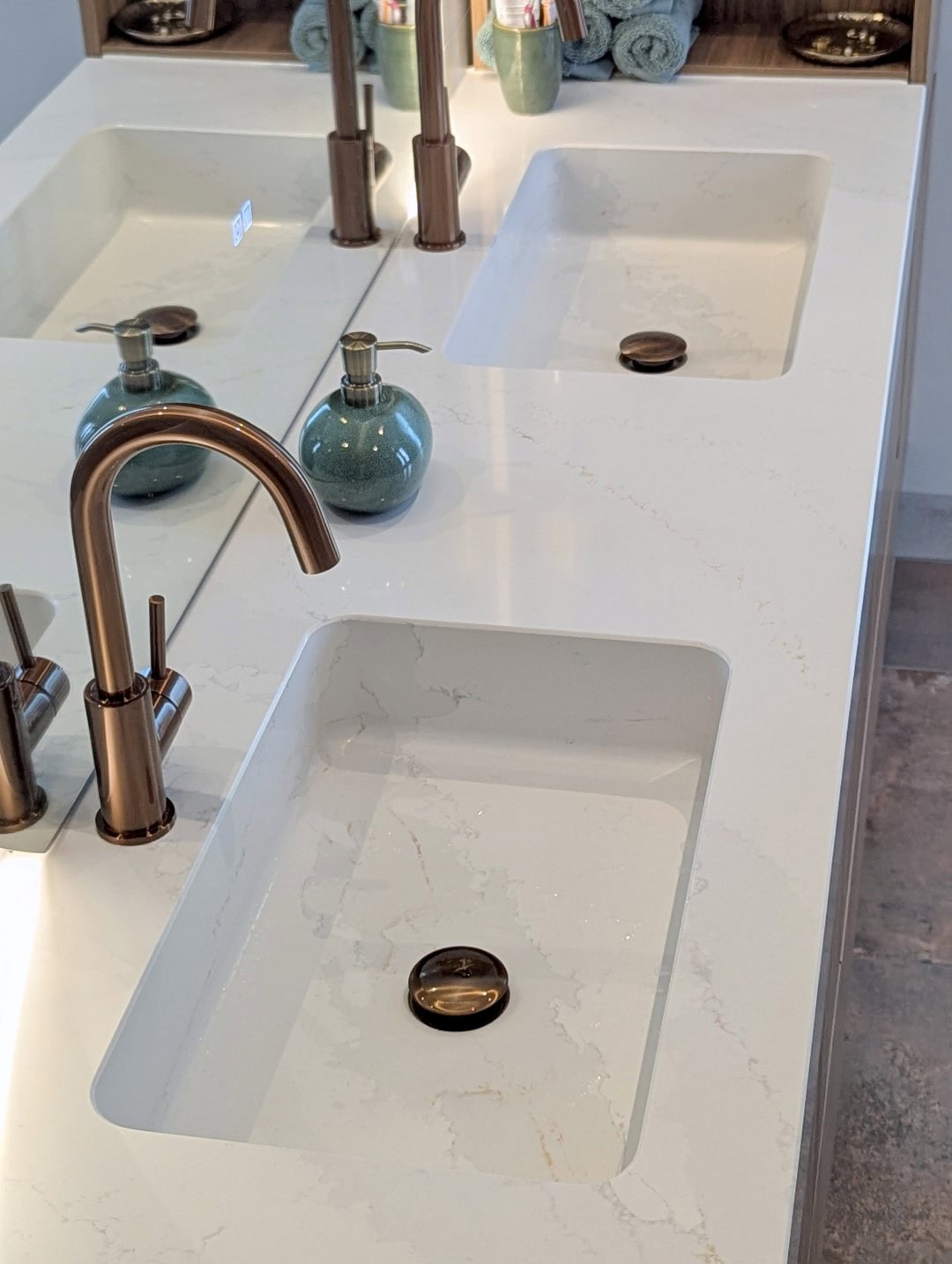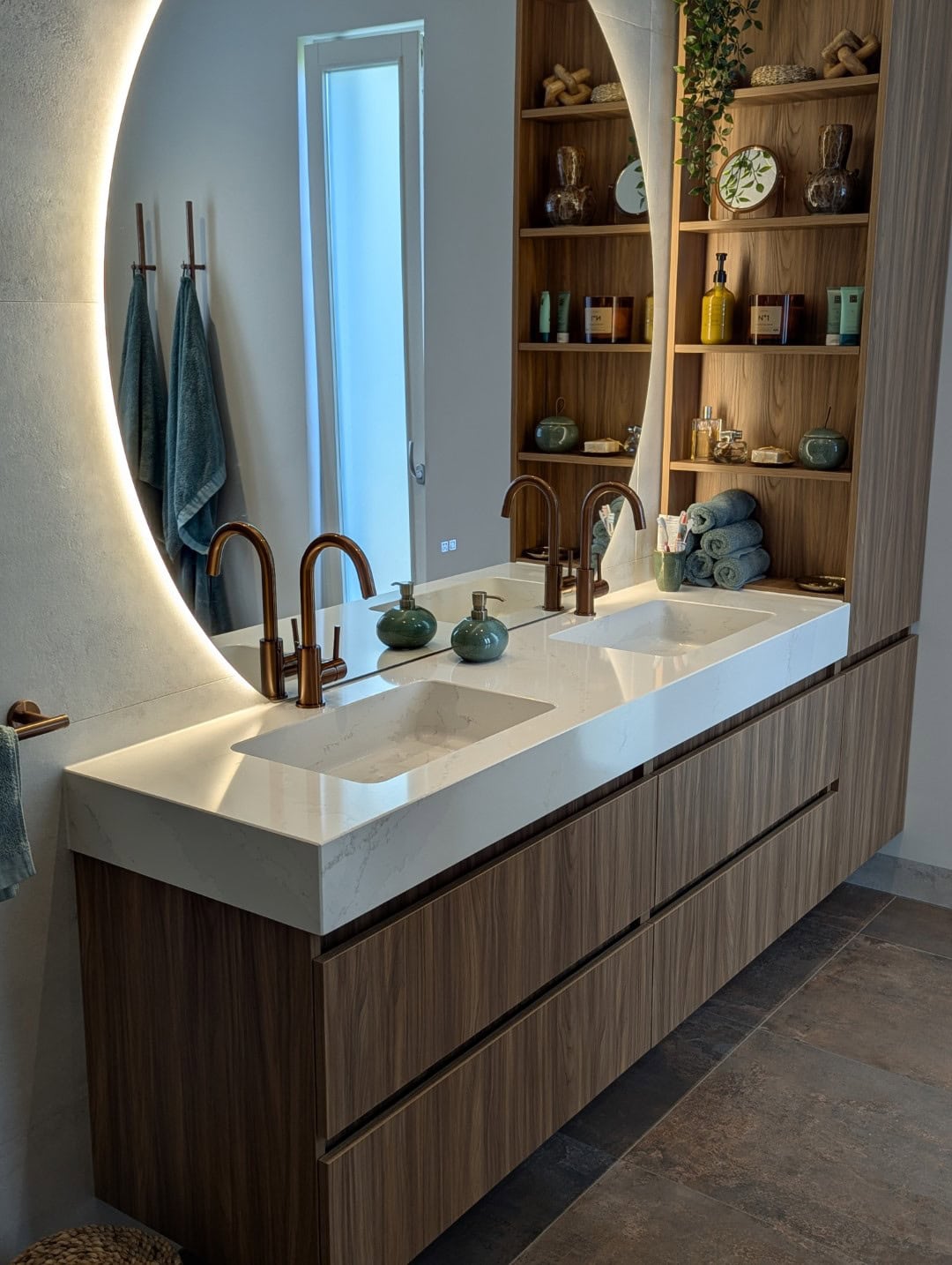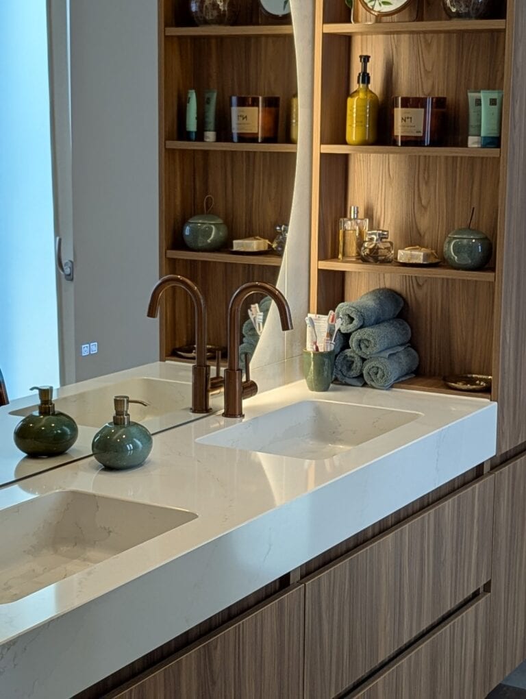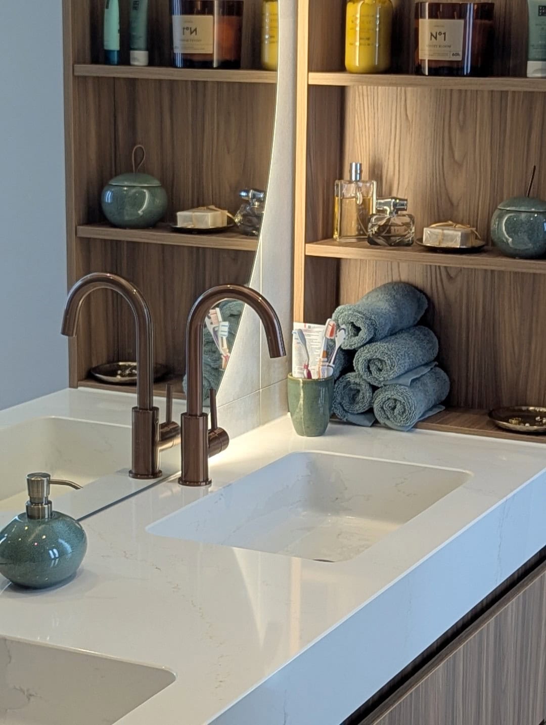Het chique wastafelblad Evita in composiet Silestone Calacatta Gold, gecombineerd met de bronzen kranen en accessoires van Brauer, vormt een stijlvolle finishing touch.