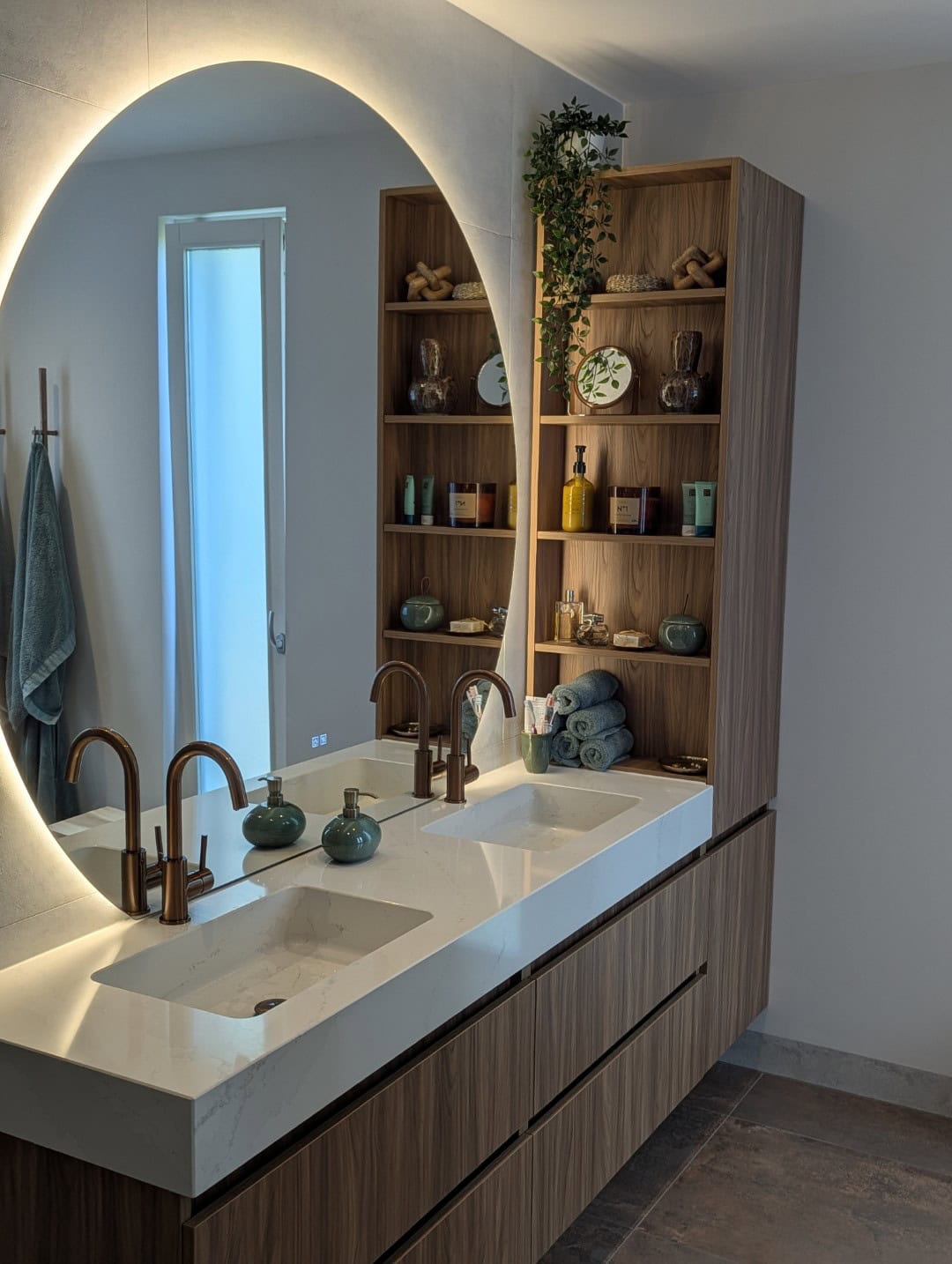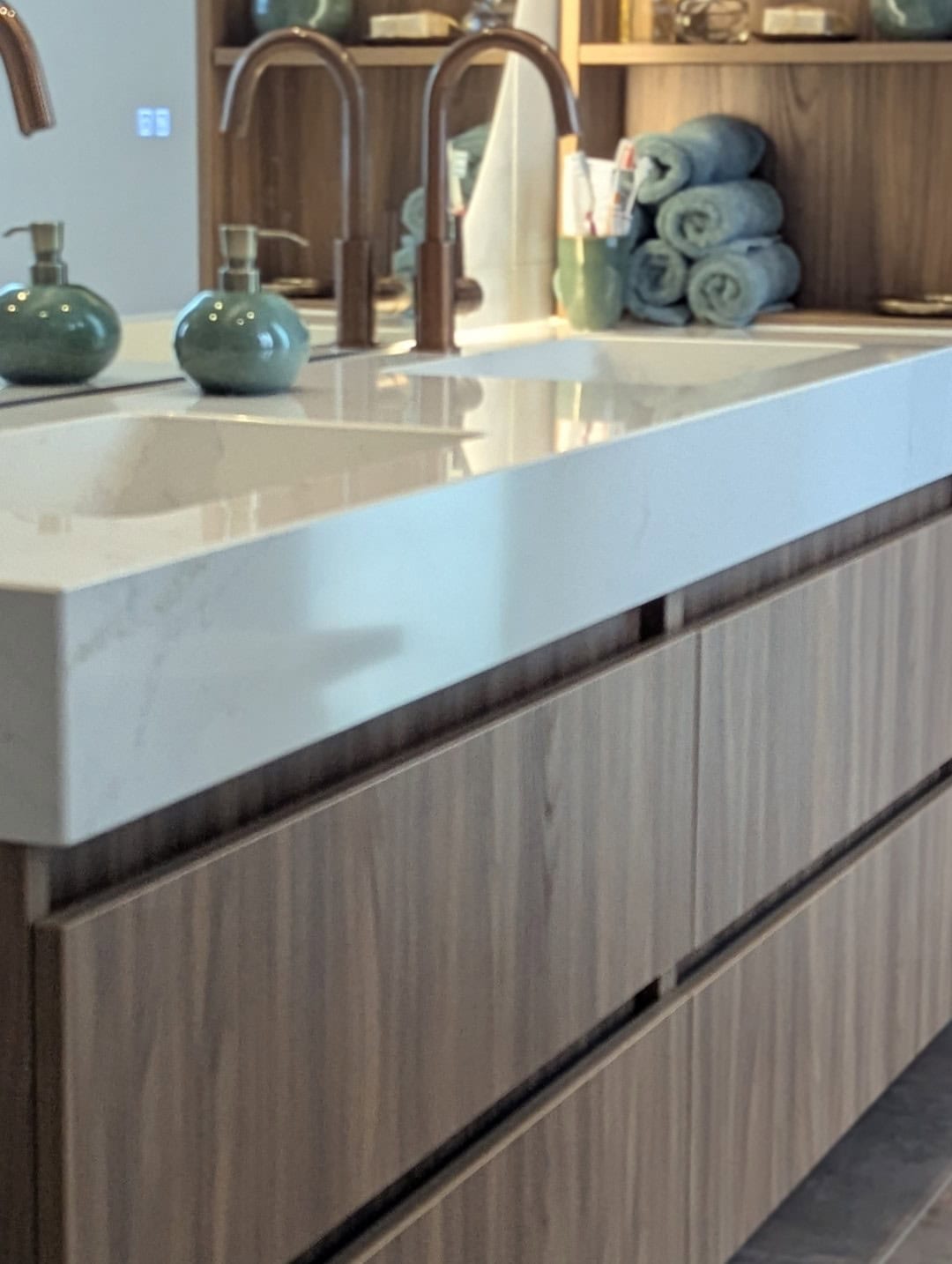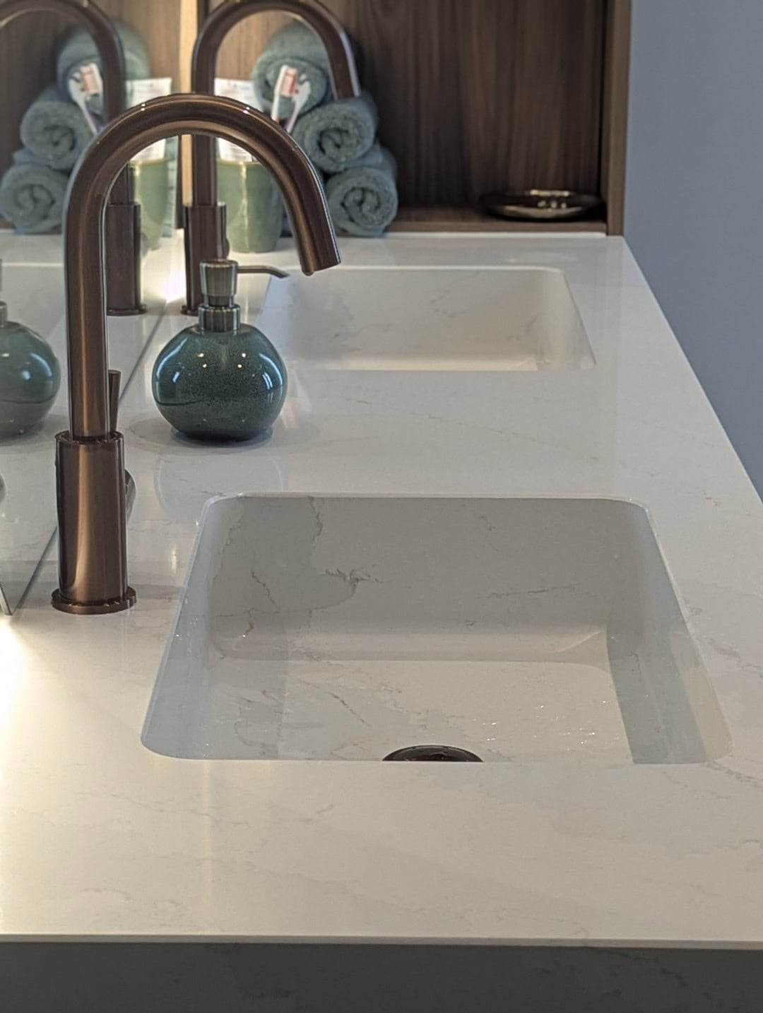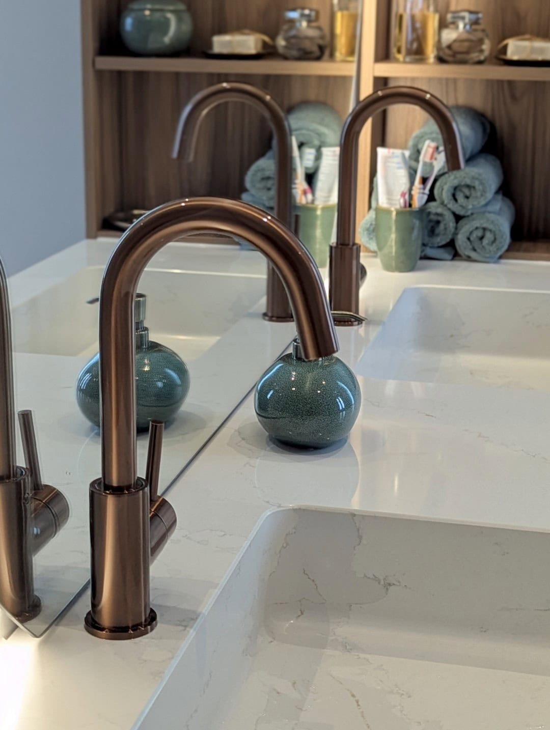 Het chique wastafelblad Evita in composiet Silestone Calacatta Gold, gecombineerd met de bronzen kranen en accessoires van Brauer, vormt een stijlvolle finishing touch.