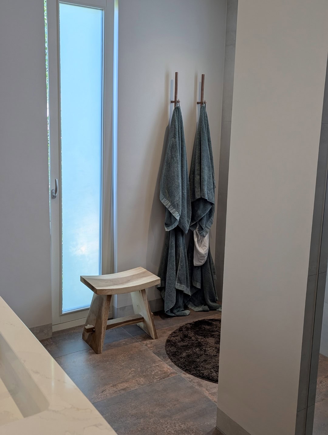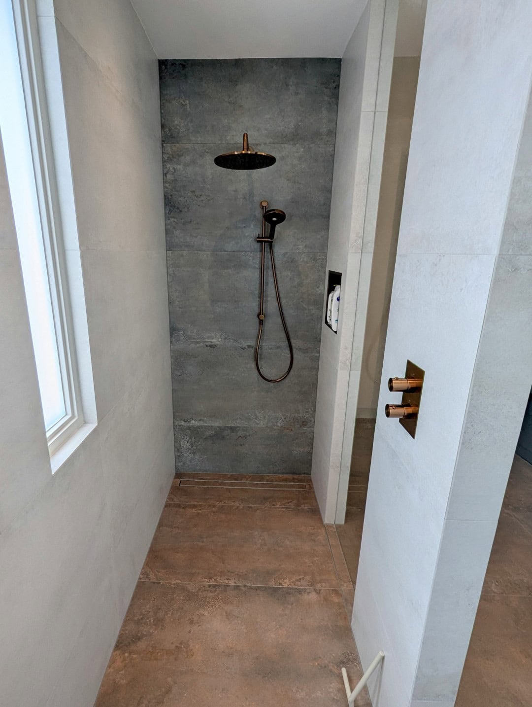Dankzij het royale glaspaneel bij de grote douche blijft het geheel licht en open.