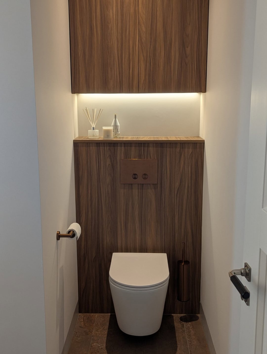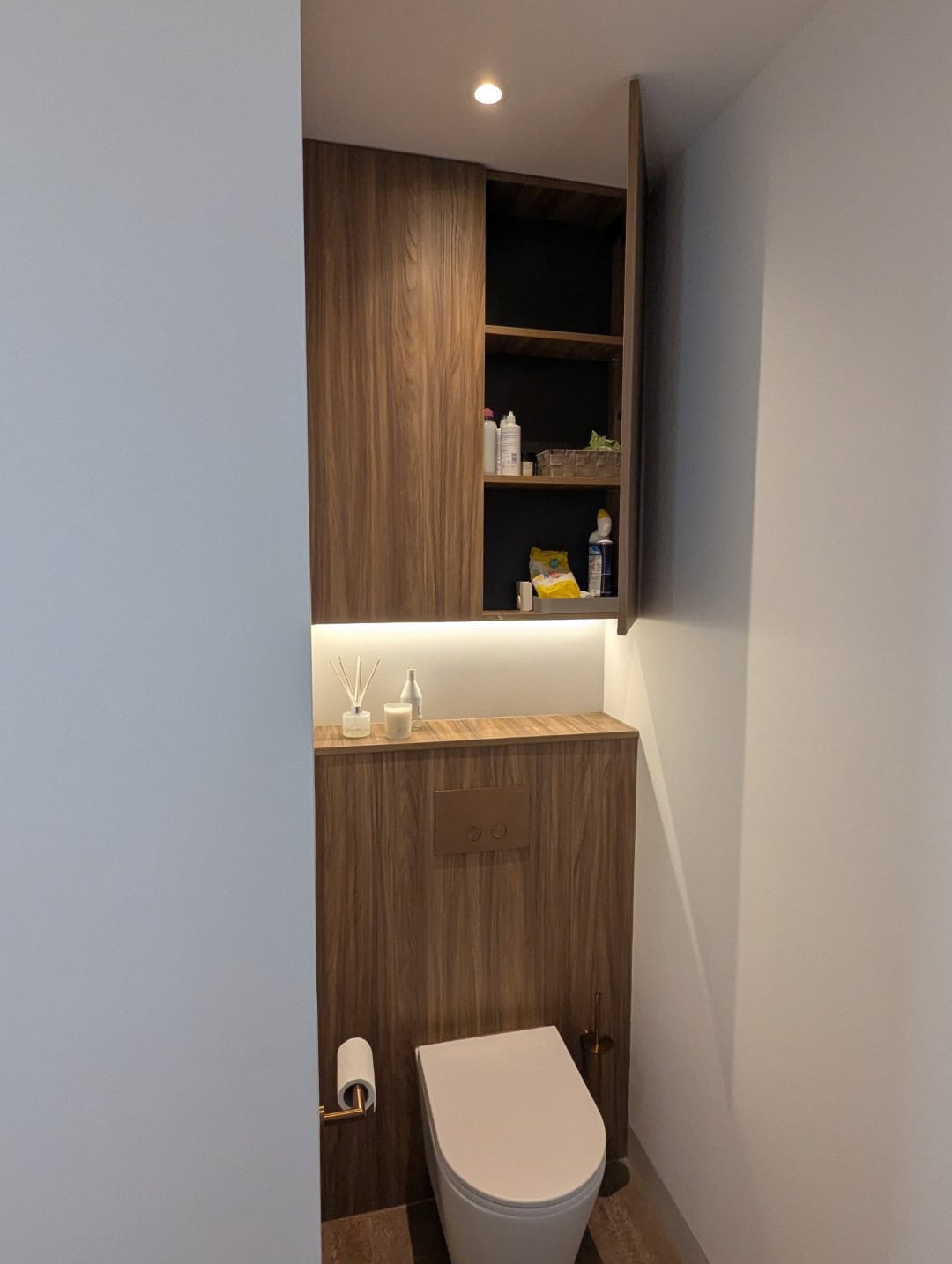 De speelse maatwerk kasten naast het wastafelmeubel en boven het toilet zorgen bovendien voor ruime en praktische opbergruimte